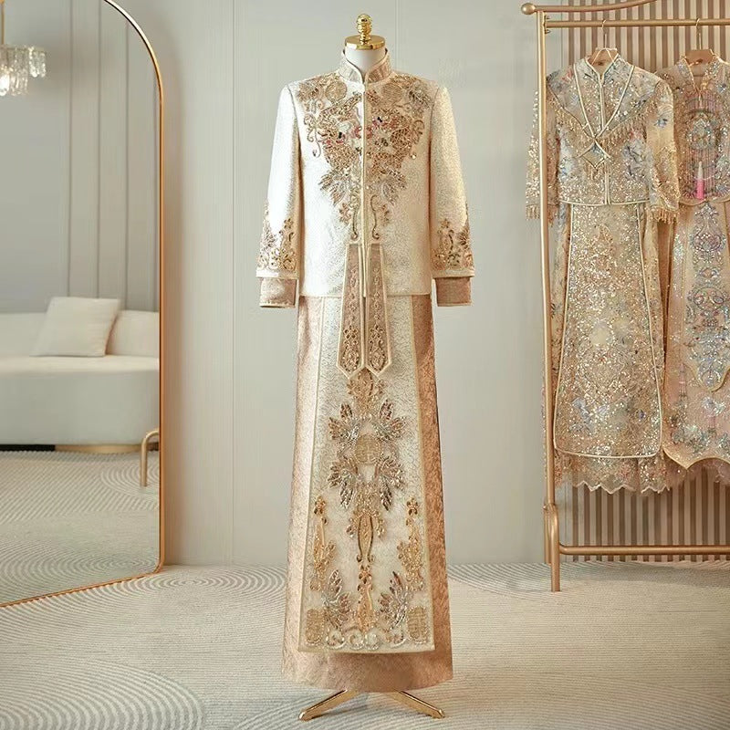 RS0001 Men's groom Chinese dress new high-end wedding reception dress heavy-duty dragon and phoenix gown men's gold